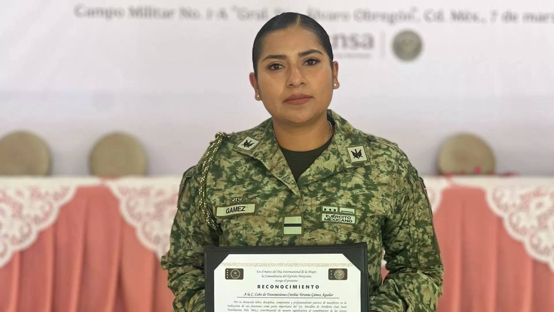 Cinthia Yerania Gámez Aguilar es cabo de transmisiones del Ejército Mexicano, donde desde hace siete años instala, opera y da mantenimiento en materia de telecomunicaciones, junto con otras militares. Su labor y trayectoria fue condecorada por la Secretaría de la Defensa Nacional, en el marco del Día Internacional de la Mujer.